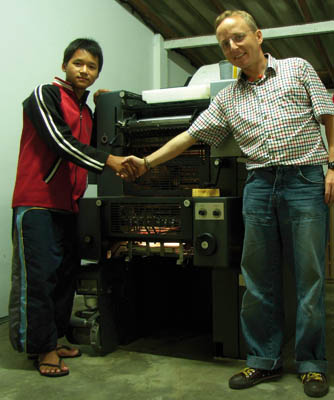 Stefan Spiecker besucht Mae Sai und gibt eine erste Einweisung in die Benutzung der Heidelberger Druckmaschine