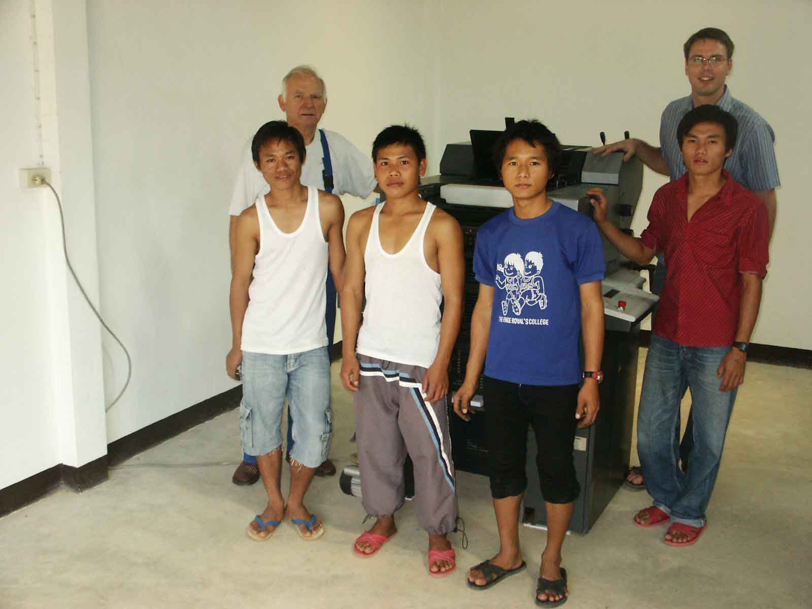 Anfang August wurde die versprochene Druckmaschine an das Ausbildungs-zentrum von Hope for Life in Mae Sai gelierfert. Die Techniker von Heidelberg stellten die Maschine auf und druckten zusammen mit dem Projektleiter Thomas Albrecht die ersten Aufträge. Stefan Spiecker wird gemeinsam mit seiner Frau Marivic im Oktober nach Mae Sai reisen und Thomas Albrecht mit nützlichen Tipps rund ums Drucken versorgen. Dazu gehört auch umfangreiches Schulungsmaterial aus der Print Media Academy der Heidelberger Druckmaschinen AG.