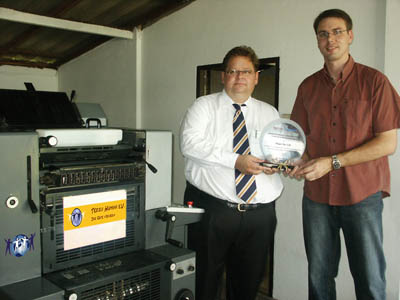 1000 € Spende sichert Drucker Schulung Da die Landesstiftung Baden Württemberg ihre Fördermittel gekürzt hatte, stand die Reise des Experten vom SES in Frage. Wir sprangen kurzfristig ein und sicherten so den Beginn der Ausbildung an der Druckmaschine.