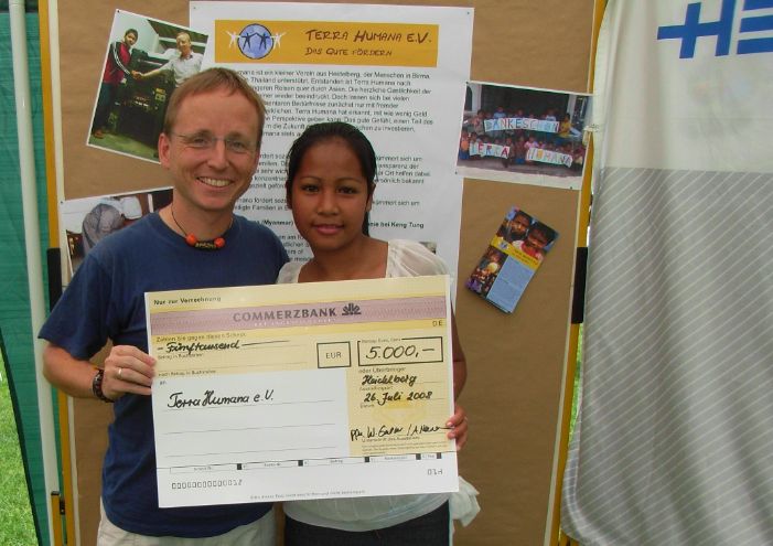 Miles For More: Offizielle Spendenübergabe von 5000 € für Lepra Kolonie in Kengtung Nach der Ankündigung im Juni erfolgte nun im Rahmen des Drachenboot Cups die offizielle Übergabe des Schecks der Heidelberger Druckmaschinen AG in Höhe von 5000 € an unseren Verein. Wir werden das Geld bei der nächsten Projektreise mitnehmen und einen lokalen Architekten zur Planung des Hauses mit nach Kengtung nehmen.