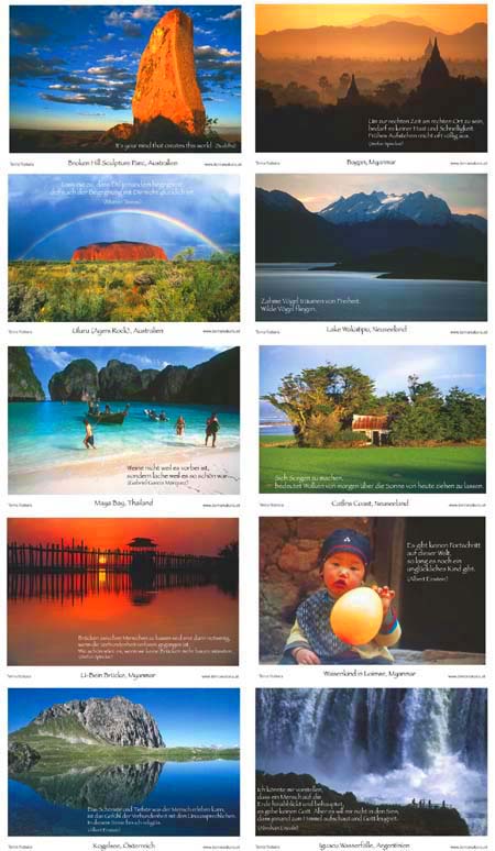 Mit 10 Motiven aus aller Welt. Jede einzelne Postkarte ziert eine kleine Weisheit. Top Qualität aus dem Hause Terra Natura. Das ganze Set kostet 12 Euro. Zum Bestellen schicken Sie uns einfach eine kurze E-Mail - Kontakt